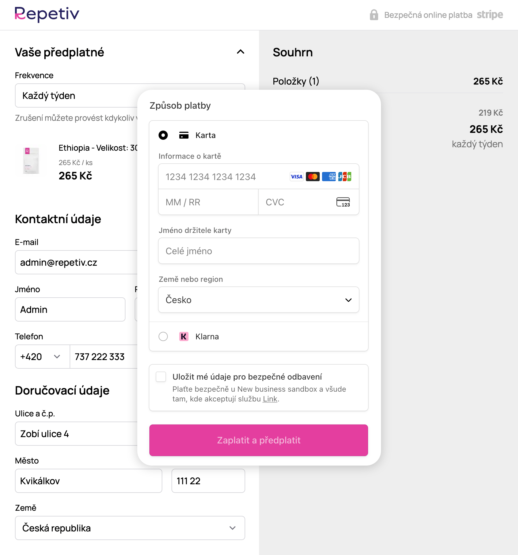 Platby přes platební bránu Stripe s možností automaticky generovaných faktur ke každé objednávce.